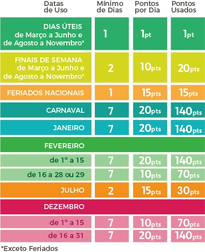 A tabela de pontos privilegia os dias de menor procura, como a baixa temporada e os dias da semana. São mais de 260 dias no ano onde uma diária custa apenas 1 ponto. E mais: mesmo nos dias de maior procura, como feriádos ou alta temporada, o valor de diária em pontos é muito menor do que uma hospedagem normal nos mesmos empreendimentos. Veja nos exemplos.